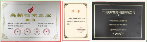 热烈祝贺广州美尔生物科技有限公司,继2017年获得国家高新技术企业认定后,现又获得“中国日用化学工业信息中心《日用化学科学》理事会理事单位”荣誉称号。